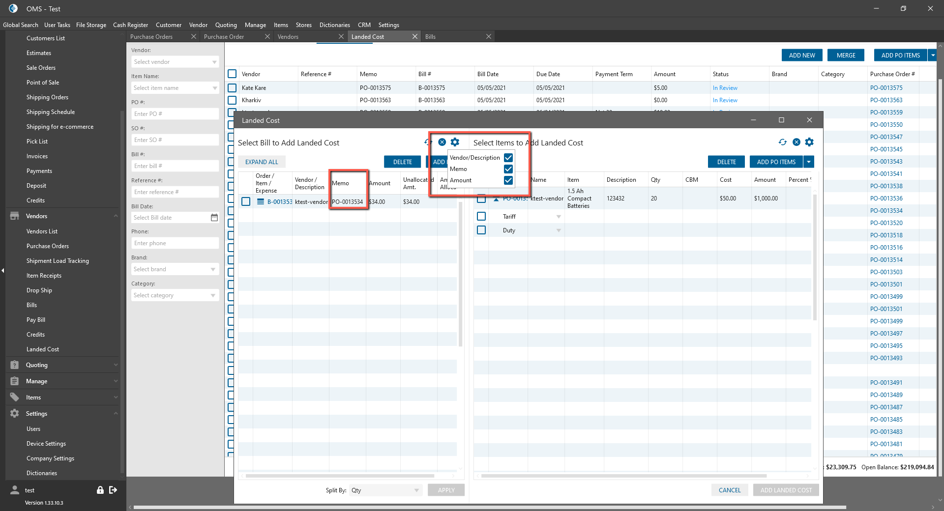 To the Landed Cost panel was added Memo column, which displays the memo from the bill.
