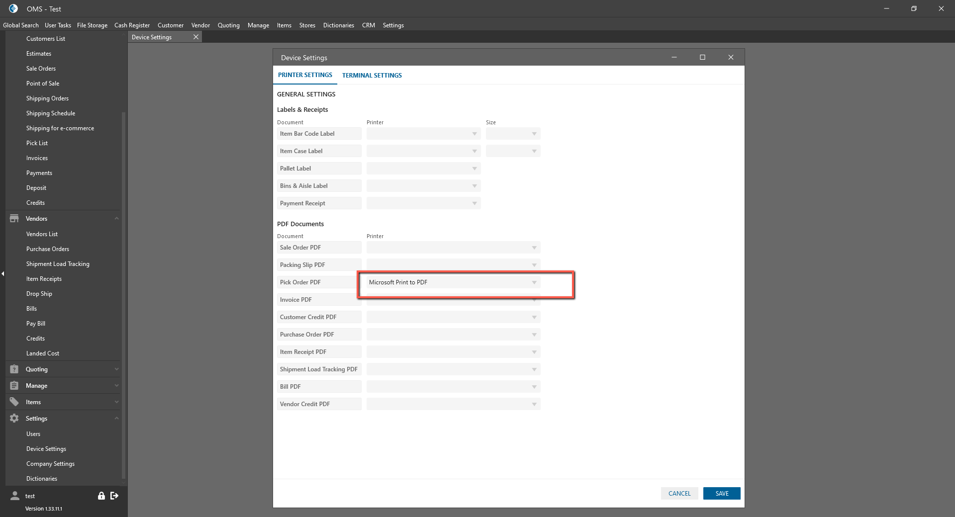 - Open Device Settings -> Pick Order PDF -> Select “Microsoft Print to PDF” -> Save;