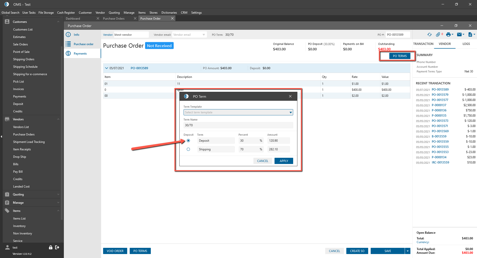 After reopening PO edit, in Payments tab is displayed selected Deposit %, which matches selected PO Terms.