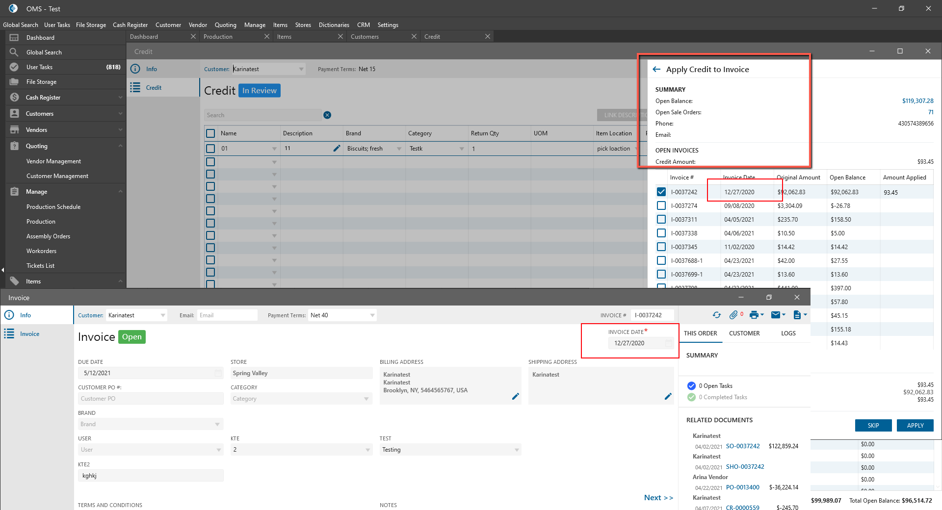 If the Customer has Invoice in Open Status -> the user has the ability to make Credit Apply to Invoice and Invoice is displayed with the correct date.