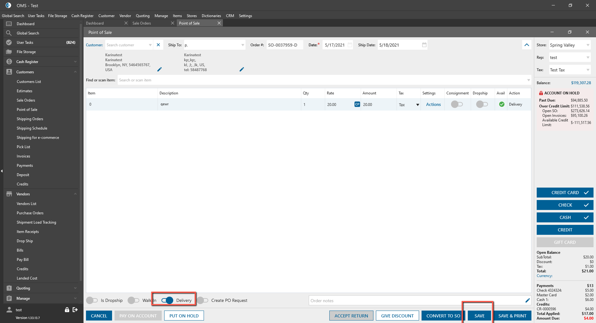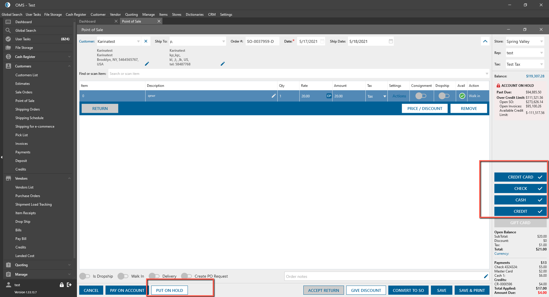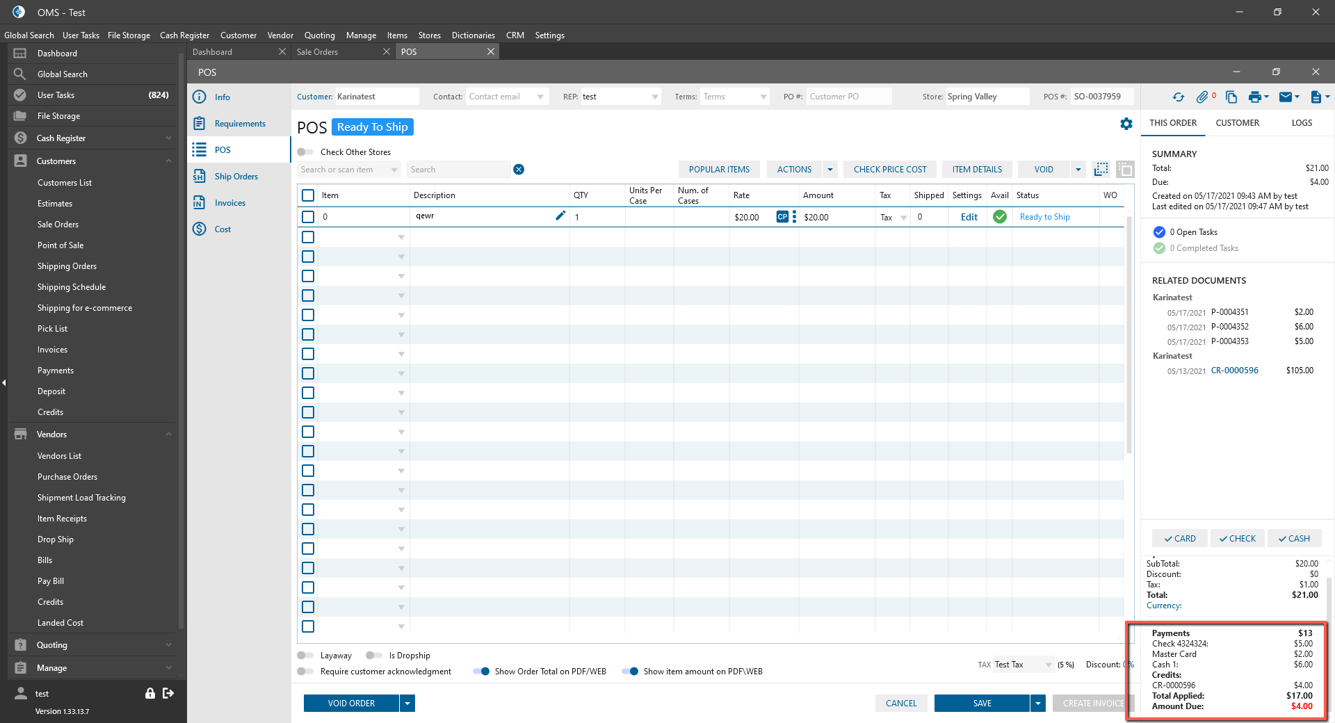 Open SO list -> Ready to ship bucket -> Open POS -> Observe Credit payment.