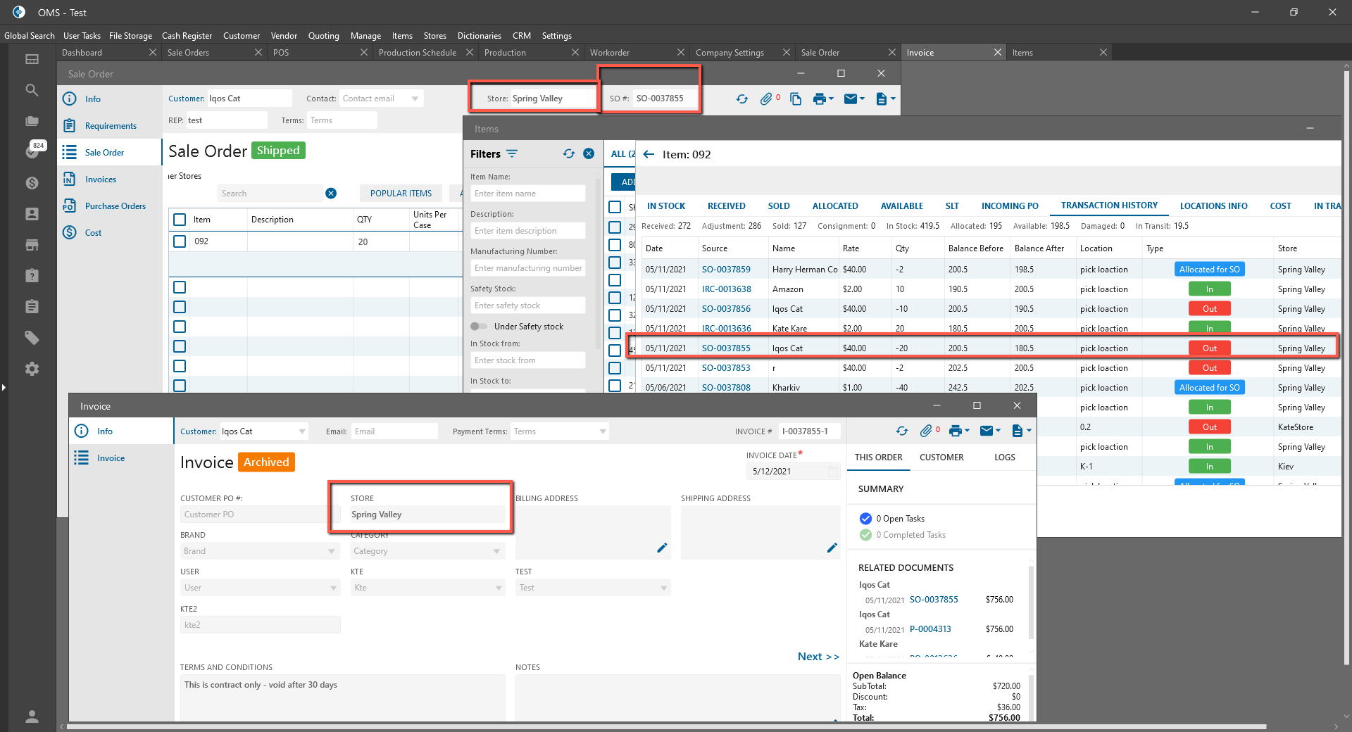 Invoices in Transaction History in Item Statistic displays with the right location.
