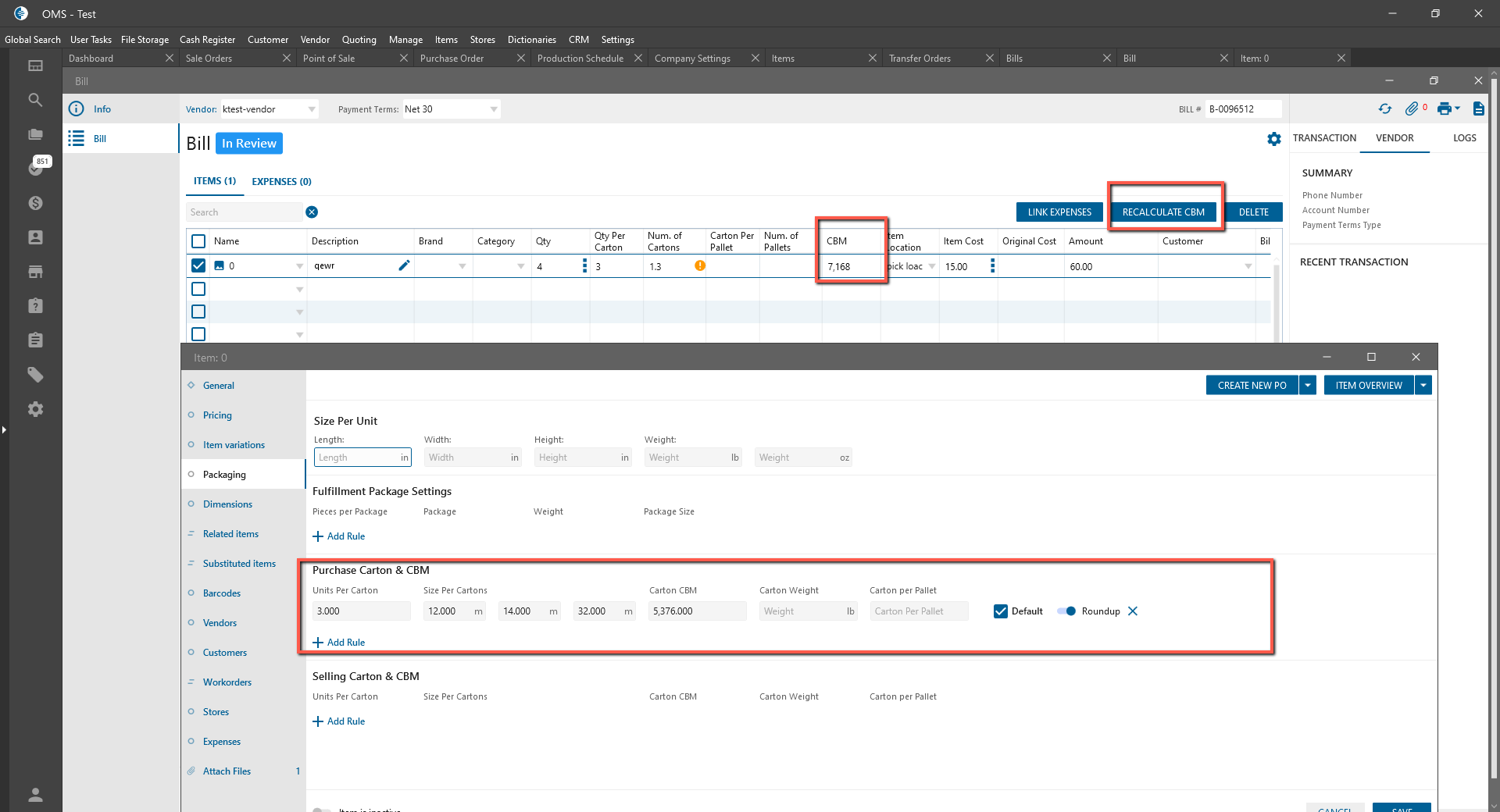 - After clicking on the button, the CBM for selected/checked items is recalculated based on Purchase Carton & CBM rules from item edit;