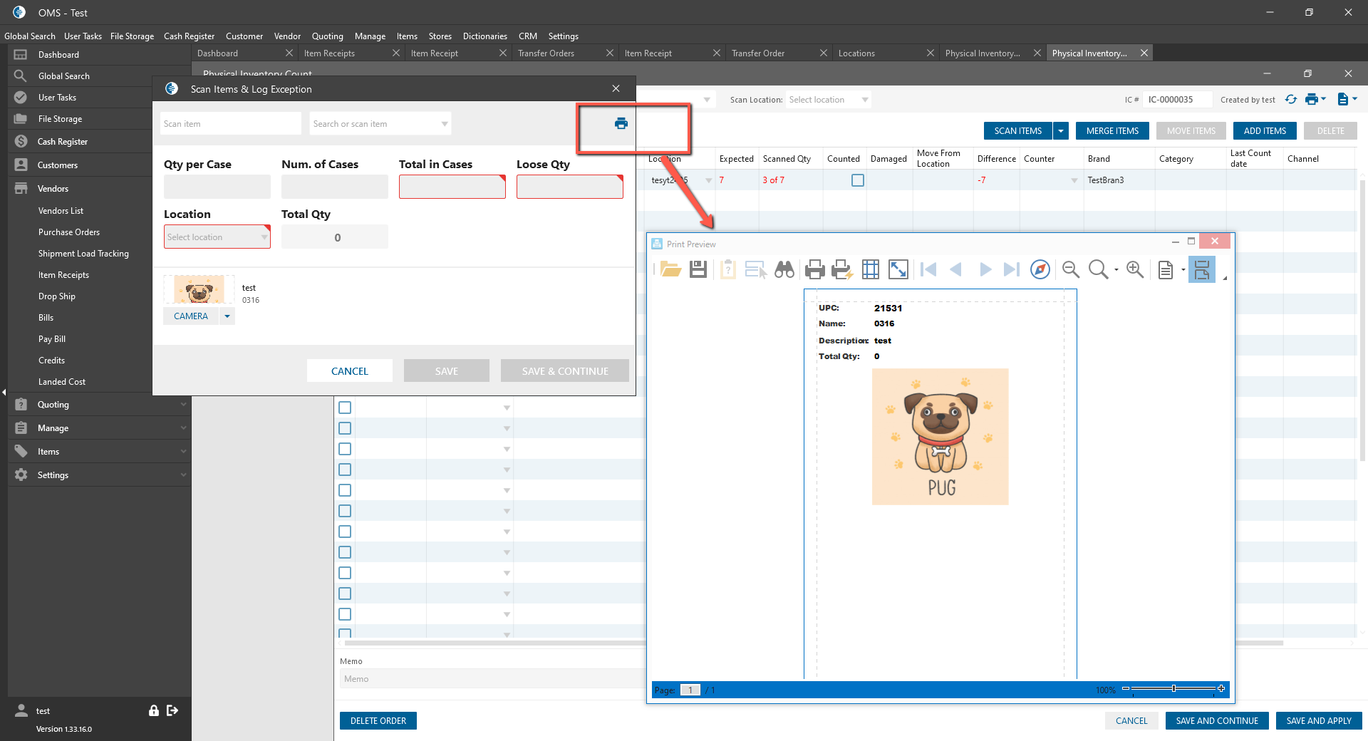On Physical Inventory Scan Items & Log Exception pop-up was added the ability to print the label of scanning item.