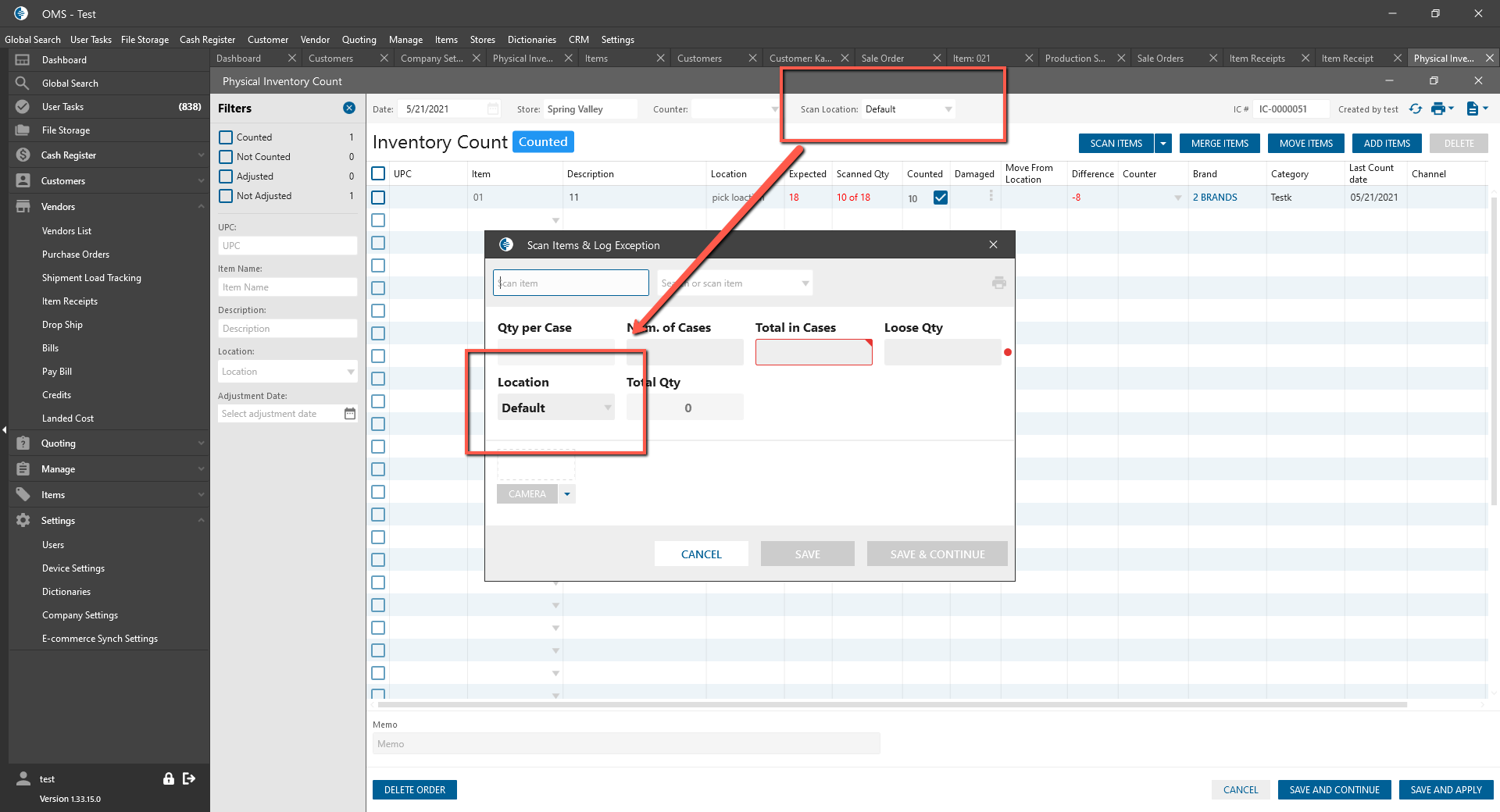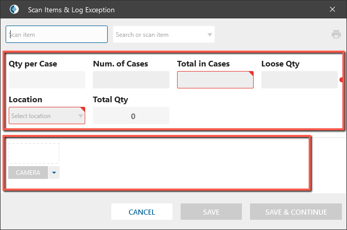Scan pop-up displays Qty per Case / Num of Cases / Total in Cases / Loose Qty /Location/Total Qty (view).