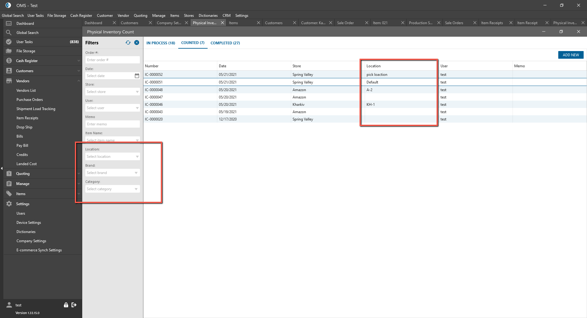 On Physical Inventory Count screen was added Location column and Location/Brand/Category filters.