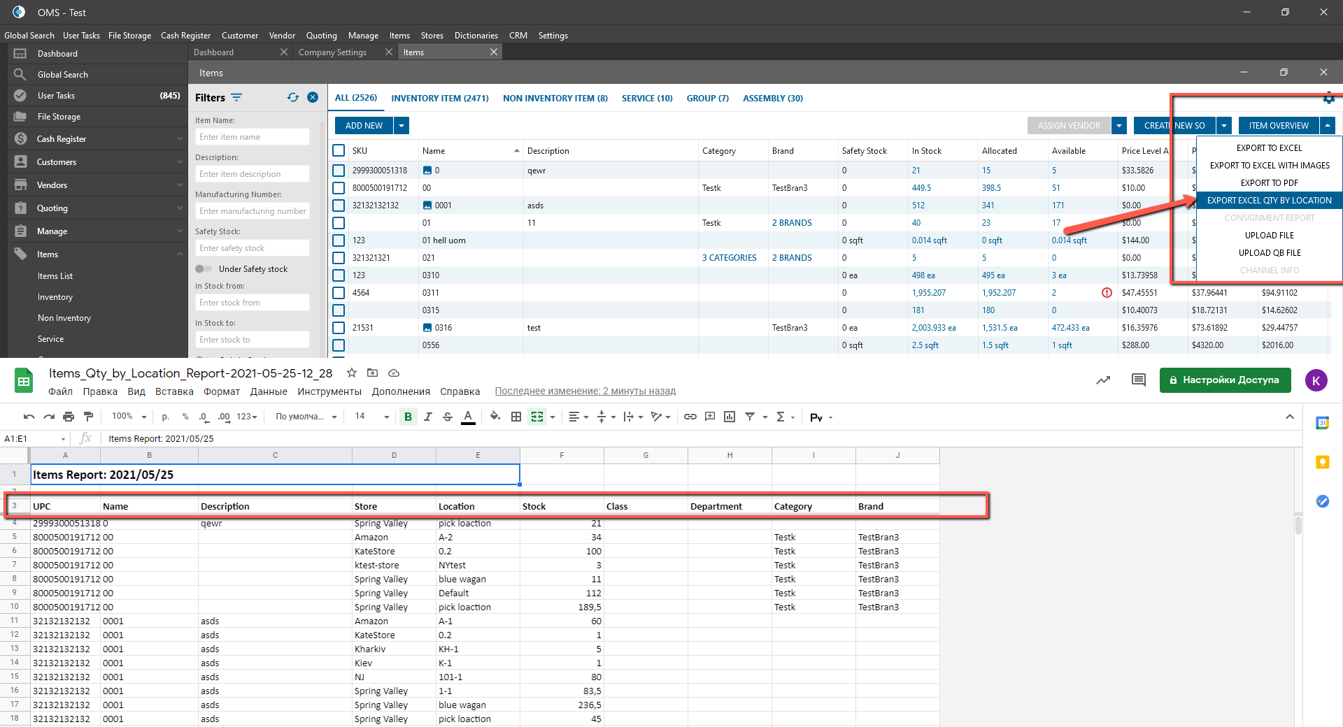 After clicking on the Export Excel Qty by Location button, Excel is generated with the next columns: