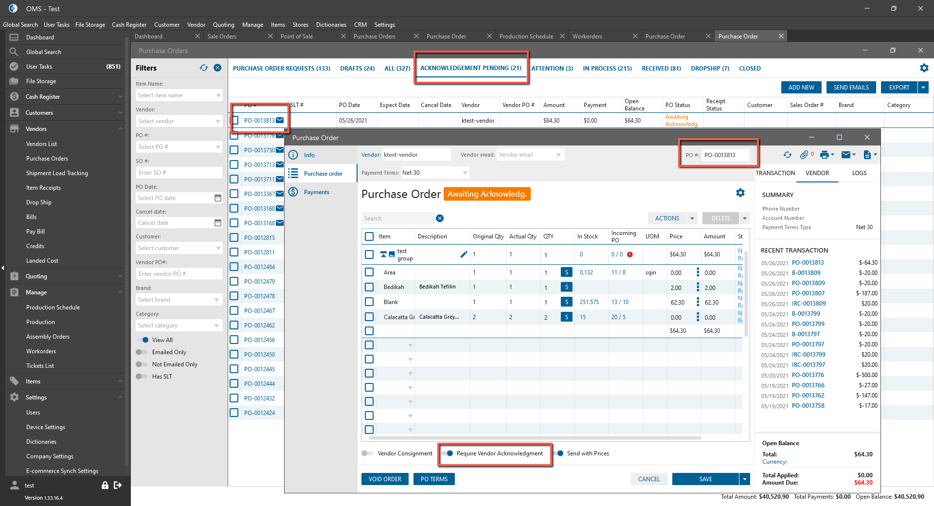 - Add group item -> Check “Require Vendor Acknowledgment” checkbox;