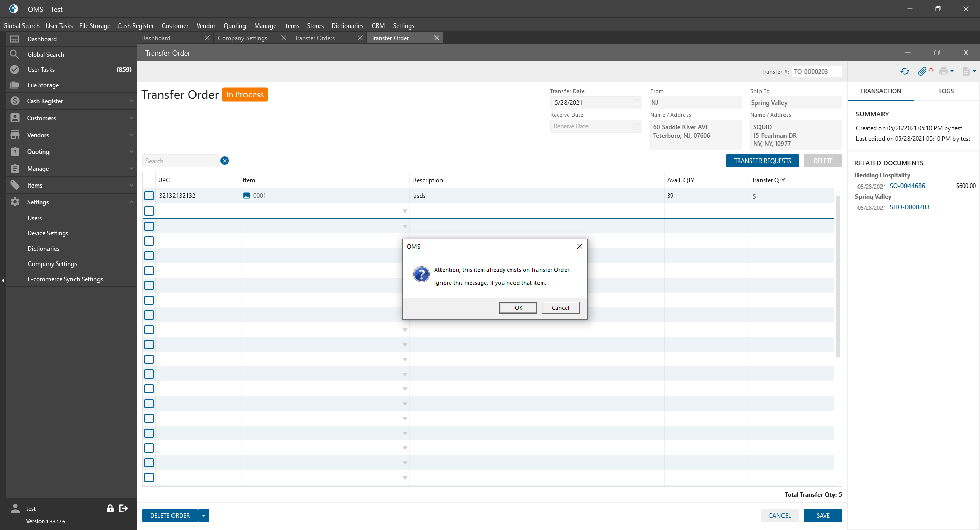 “Attention, this item already exists on Transfer Order. Ignore this message if you need that item. OK/Cancel”
