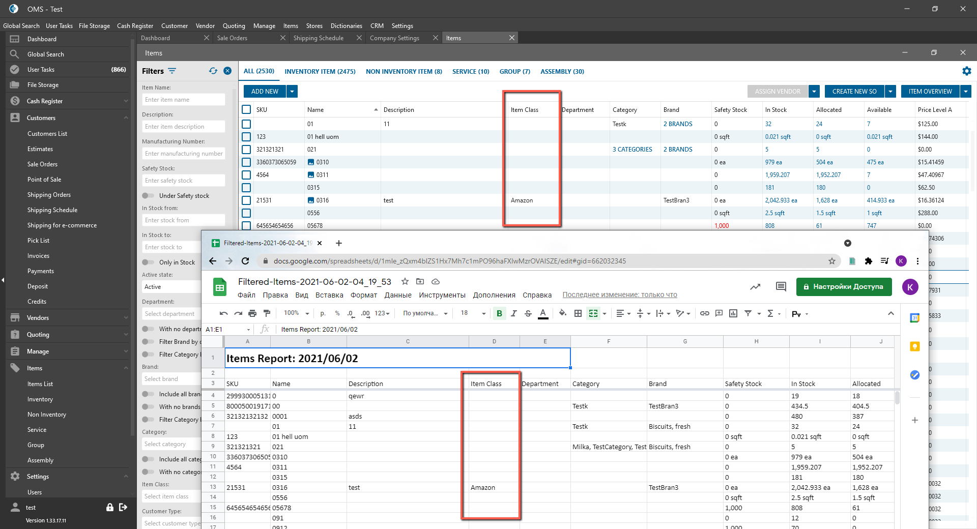To Item List Excel Report was added Item Class column after clicking on the Export to Excel button.
