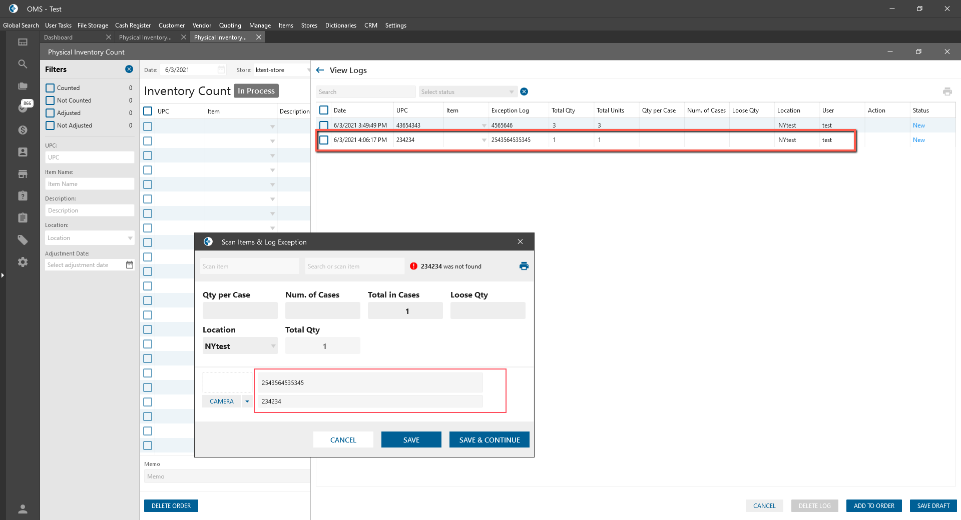 On Scan Items & Log Exception pop-up was added the ability to scan the item and after that add the UPC of this item.