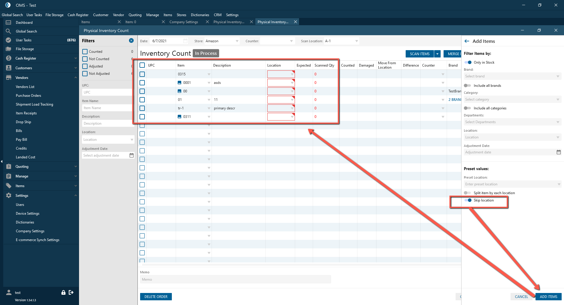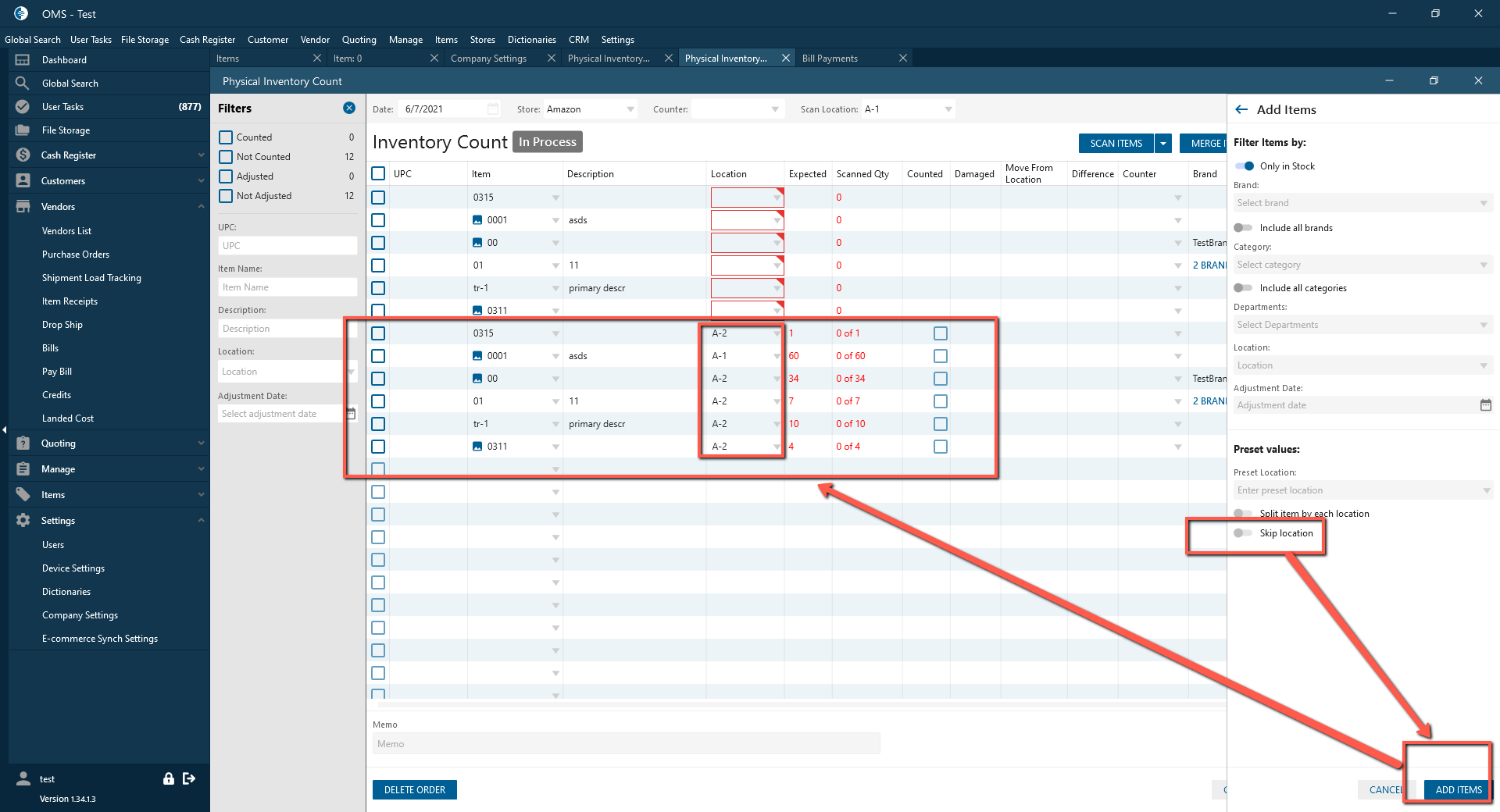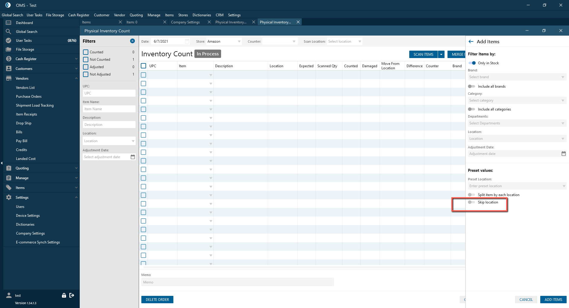 - If the checkbox is checked and Location is selected in filters on the panel -> The items are filtered according to the selected location -> But the location isn’t added to the Physical inventory count datagrid.