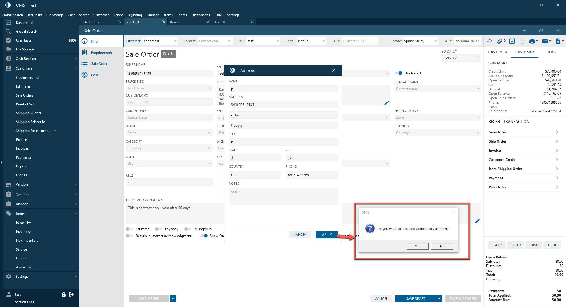 If was changed/added new address for Customer -> After clicking on the Apply button -> The message is displayed: “Do you want to add new address to Customer? Yes /NO“: