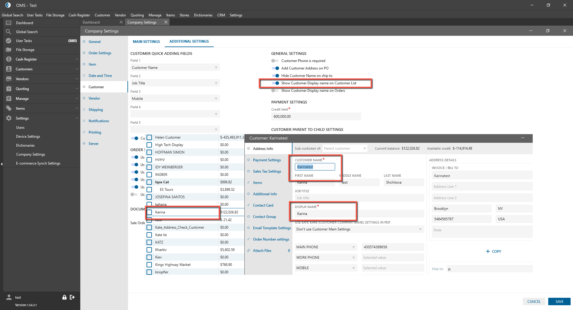 - “Show Customer Display name on Customer List” checkbox: