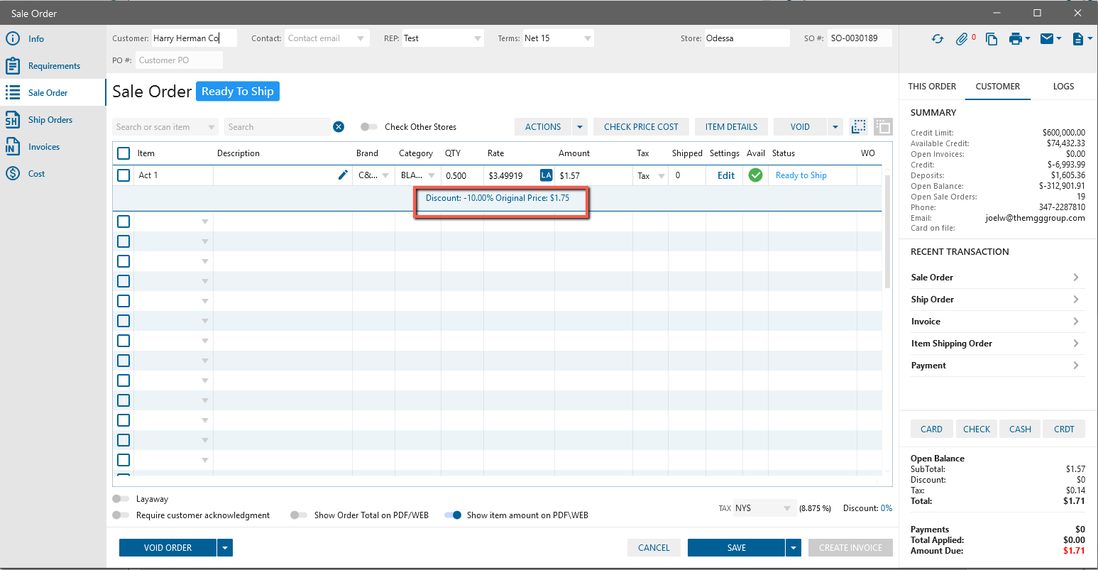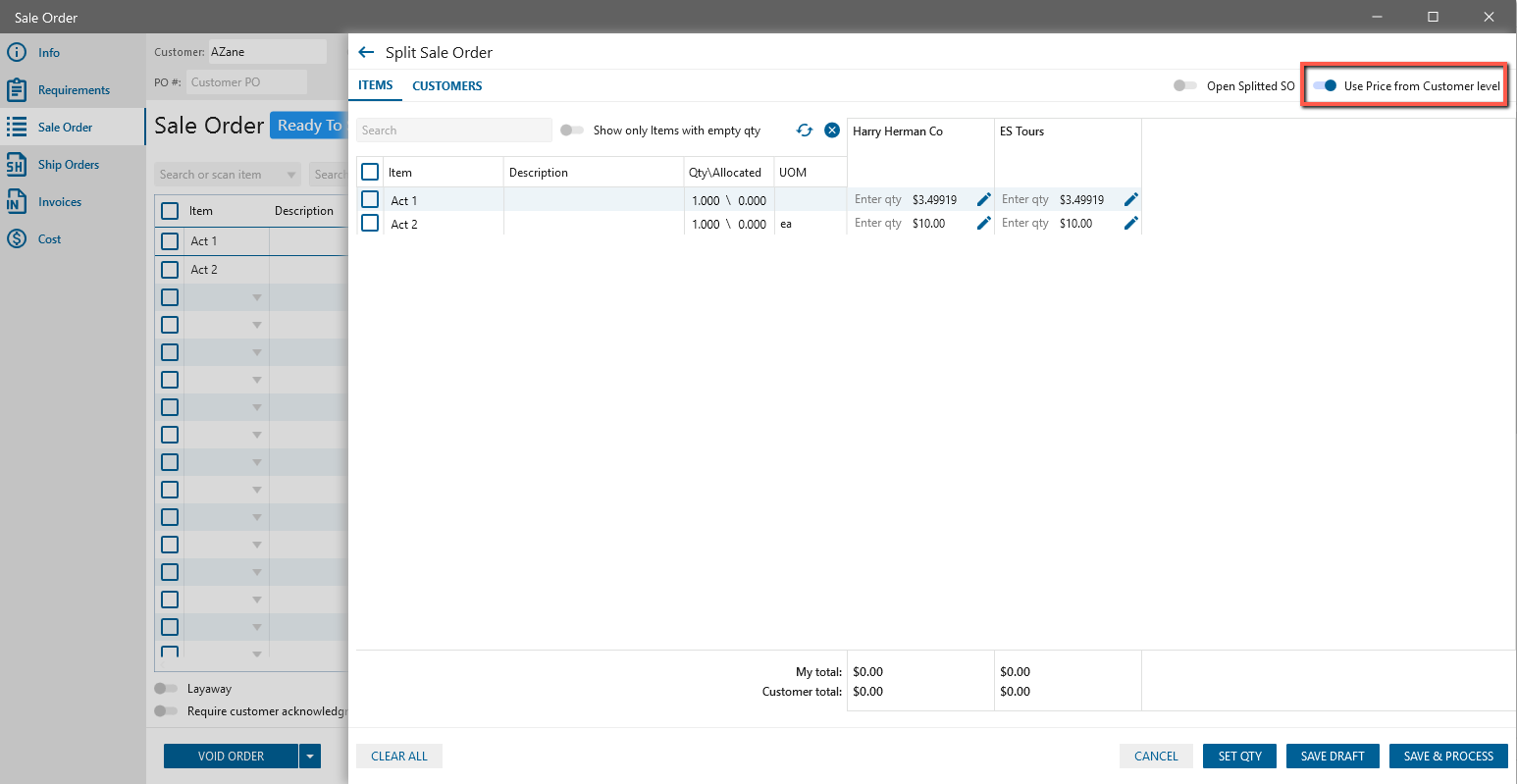 if on the Sale order -> Split Order panel was switched on the “Use Price from Customer level” after the split Sale Order the Customer item discount (if exist) should be applied to new order