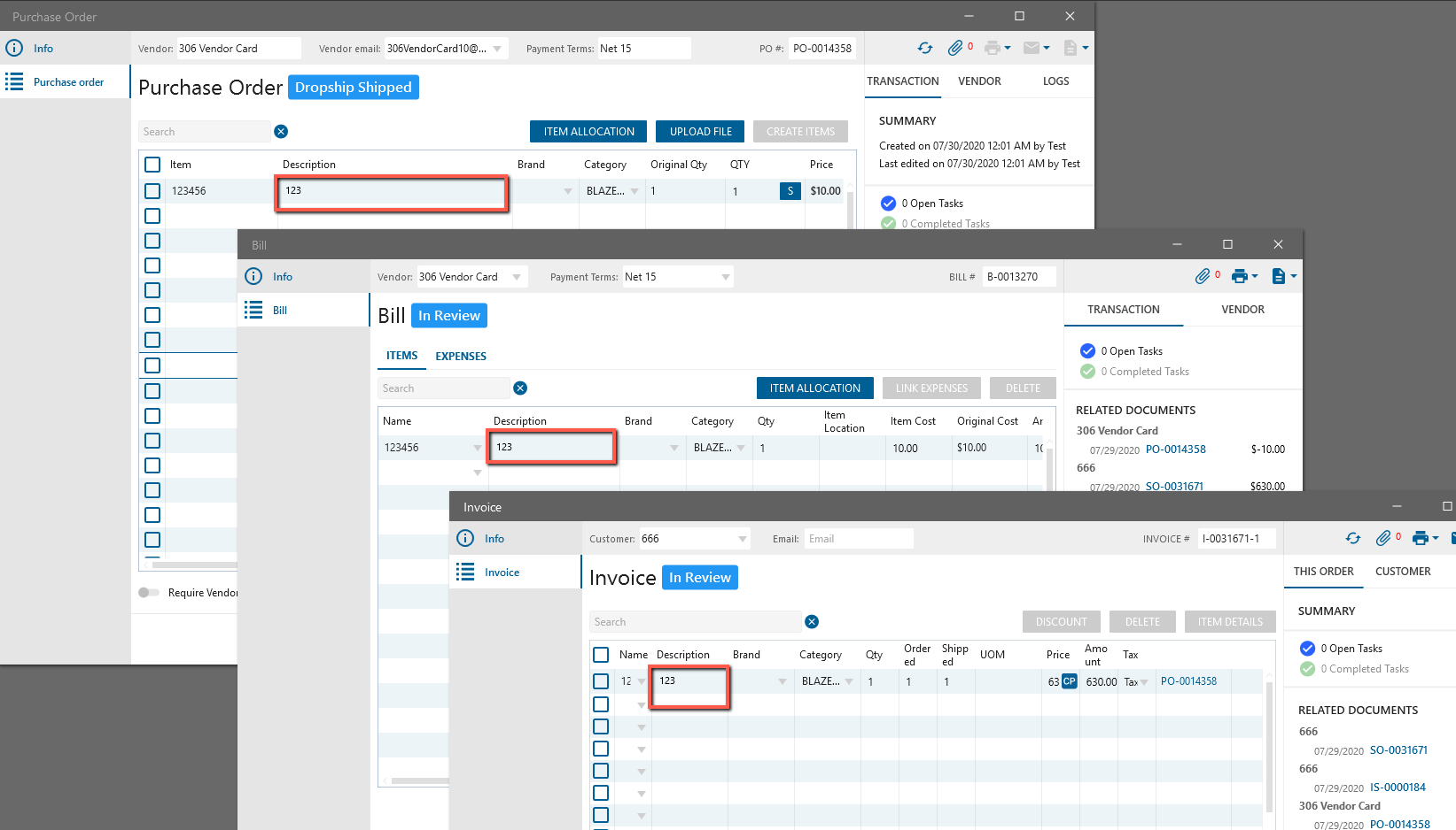 If Purchase order was created as dropship the item description should be copied from PO to related Item Shipping, Bill, Invoice