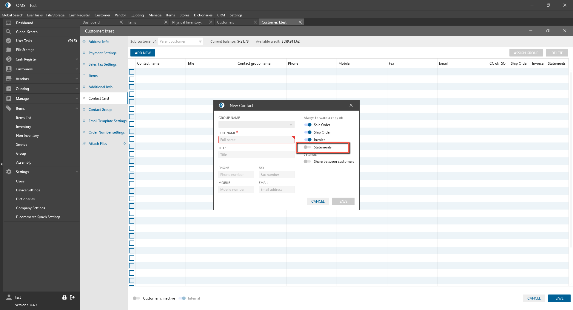- Contact Card tab -> New Contact pop-up: