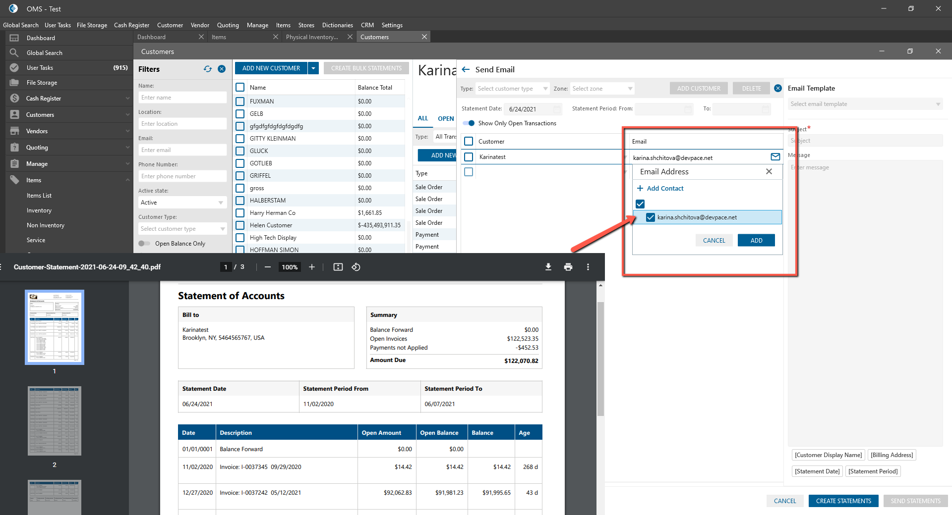 - After selecting of email in dropdown -> For this user is sent Statement of Accounts PDF;