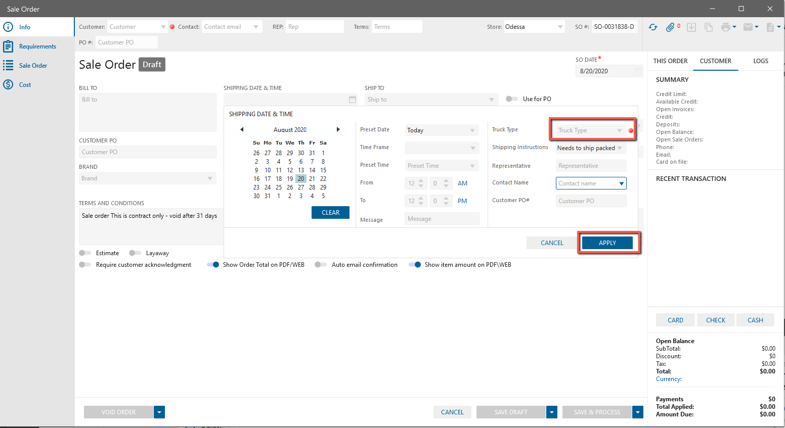 Added validation to the “Truck type” field on “Shipping Date & Time” popup if the Truck type is required and was not filled after clicking on the “Apply” button user will not be redirected to the Sale Order tab automatically