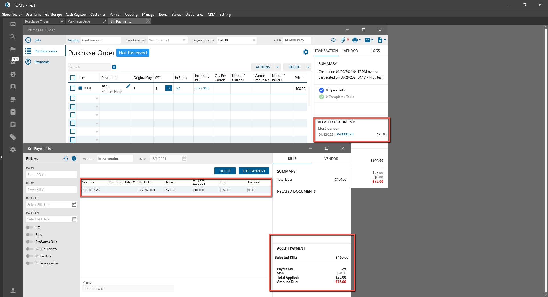 Linked Vendor Credit is shown on PO Linked Documents with the proper amount.