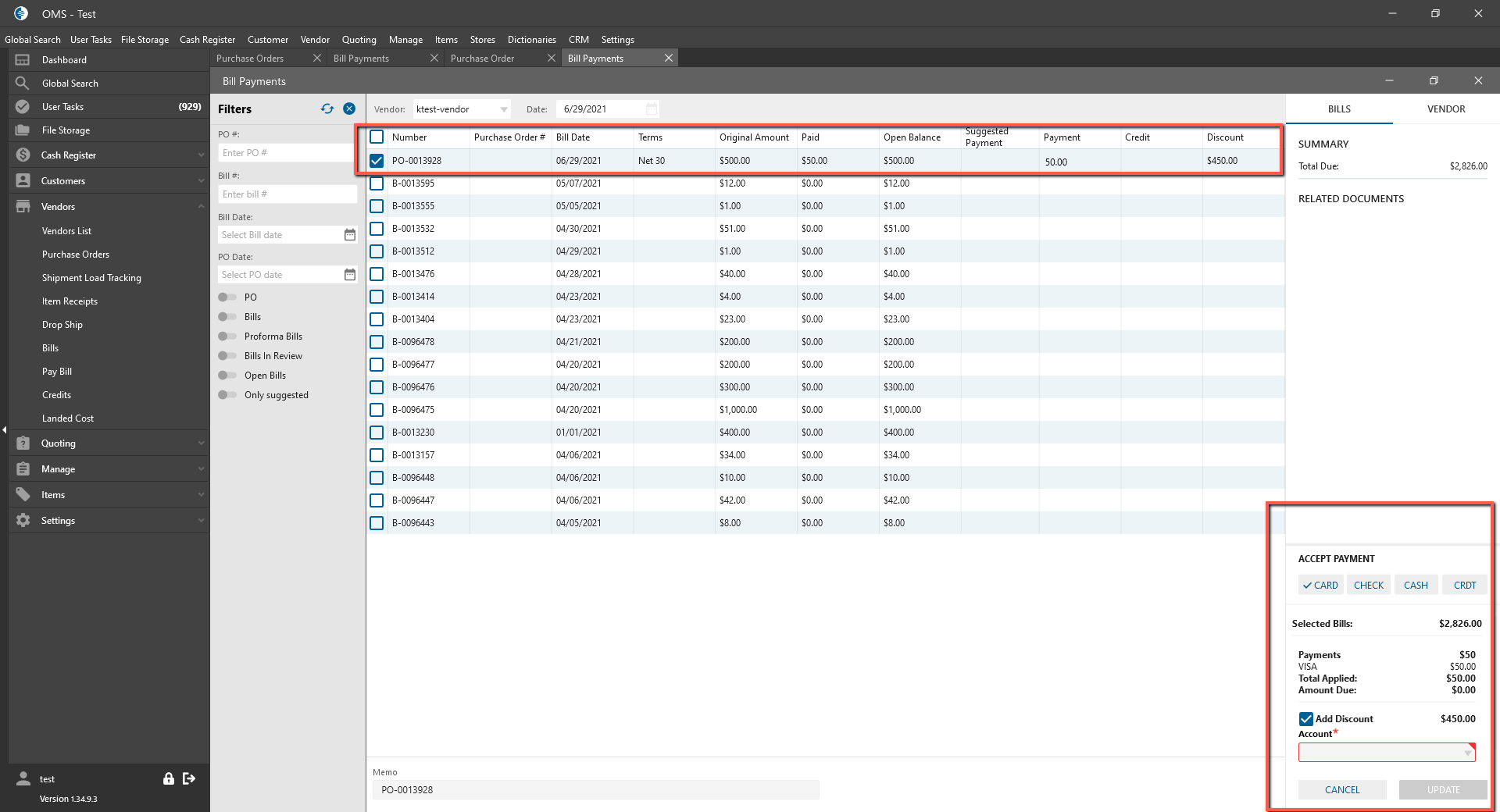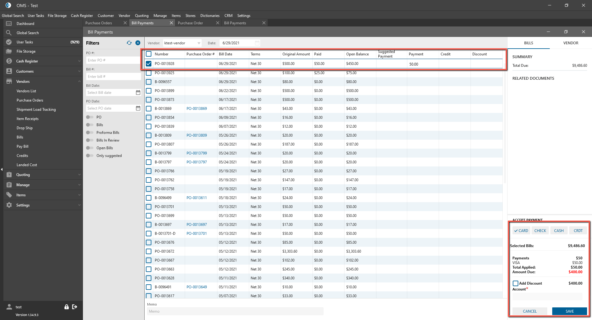 - Open Bill Payments list, check created PO, add Payment $50 -> Save;