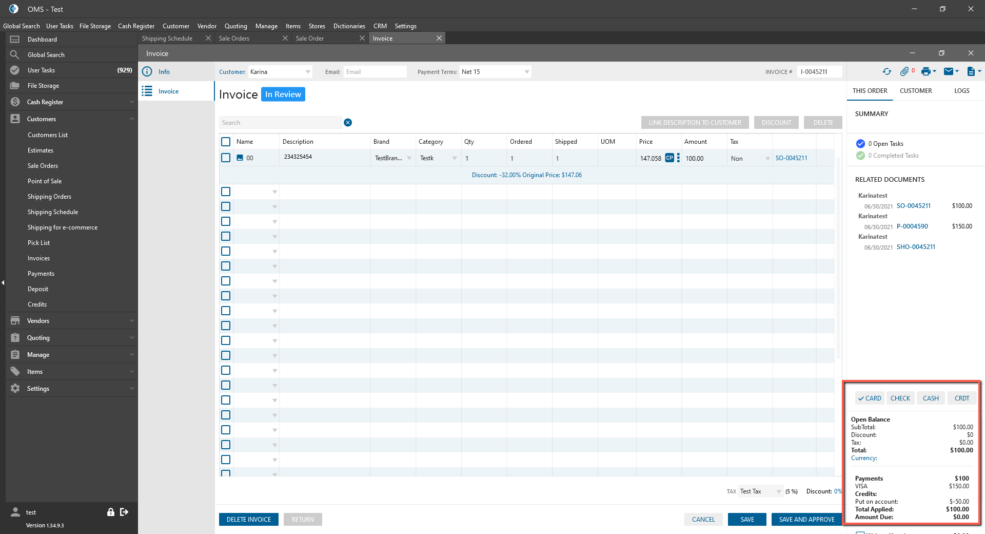 - Create Invoice -> Add Payment by Credit Card = 150$ -> Save;