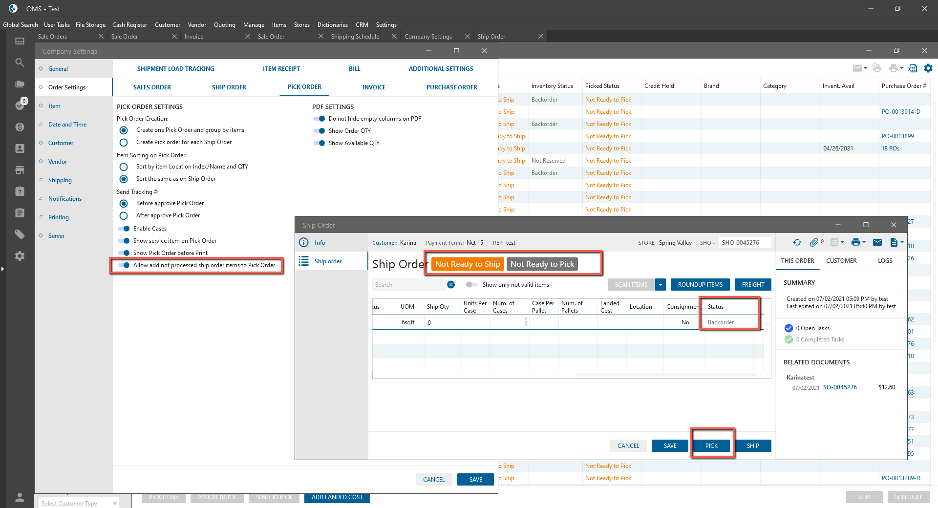 - Is possible to Pick an Order with Not Reserved, Check Stock, Backorder items if “Allow add not processed ship order items to pick order” checkbox is checked.