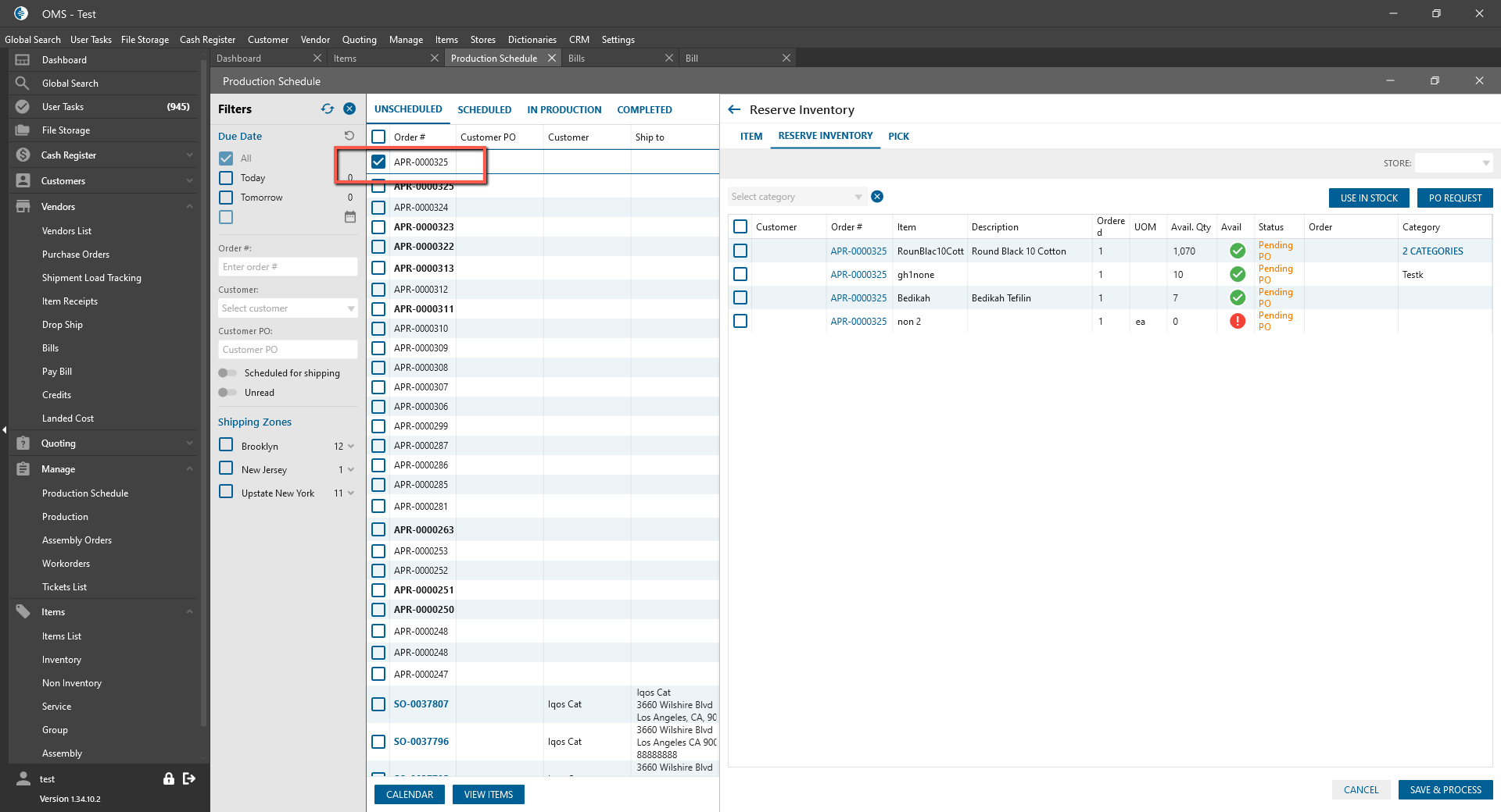 - Create Production Request -> Save & Process;