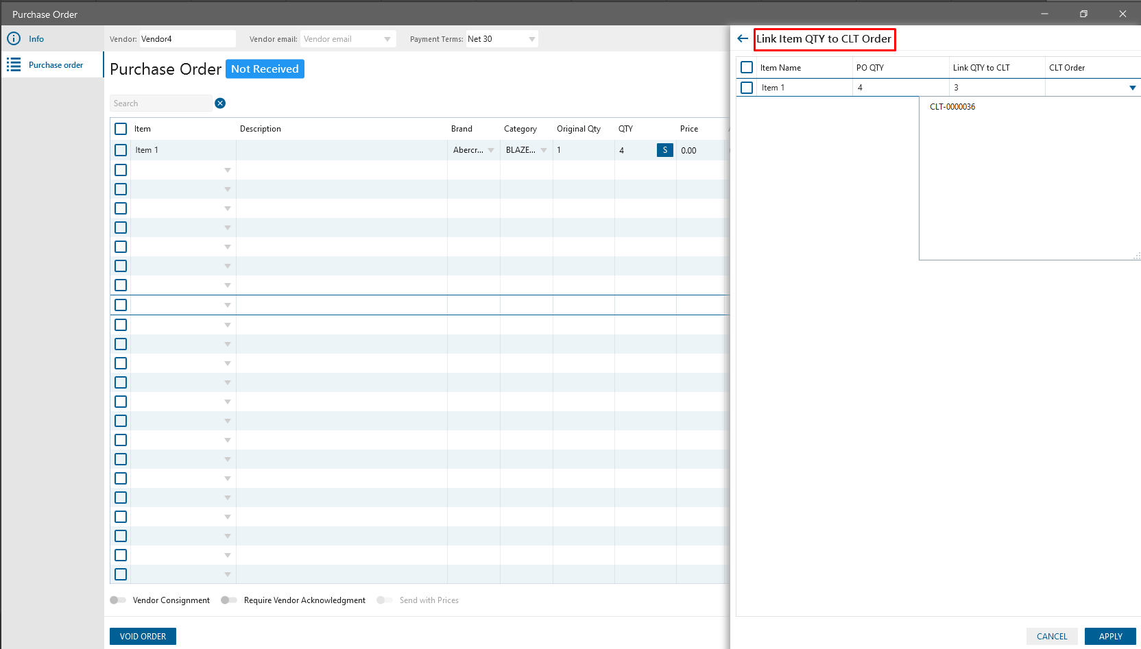 If line item was increased/newly added and PO linked to CLT then the “Link item qty to CLT Order” panel will be opened with items which were increased or newly added