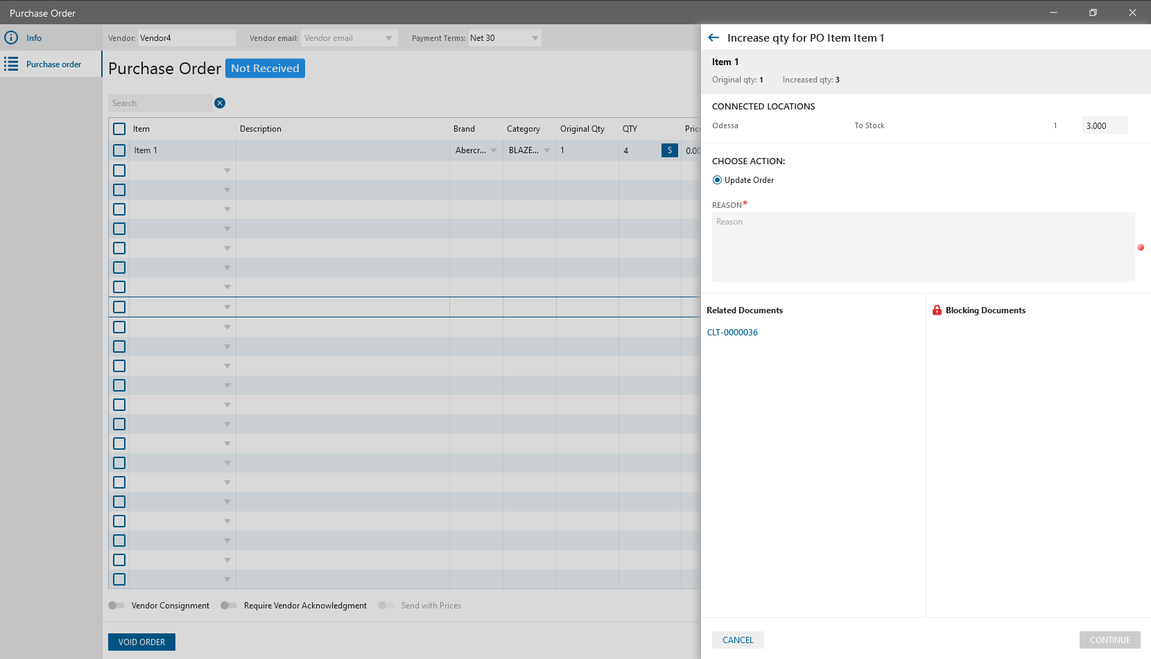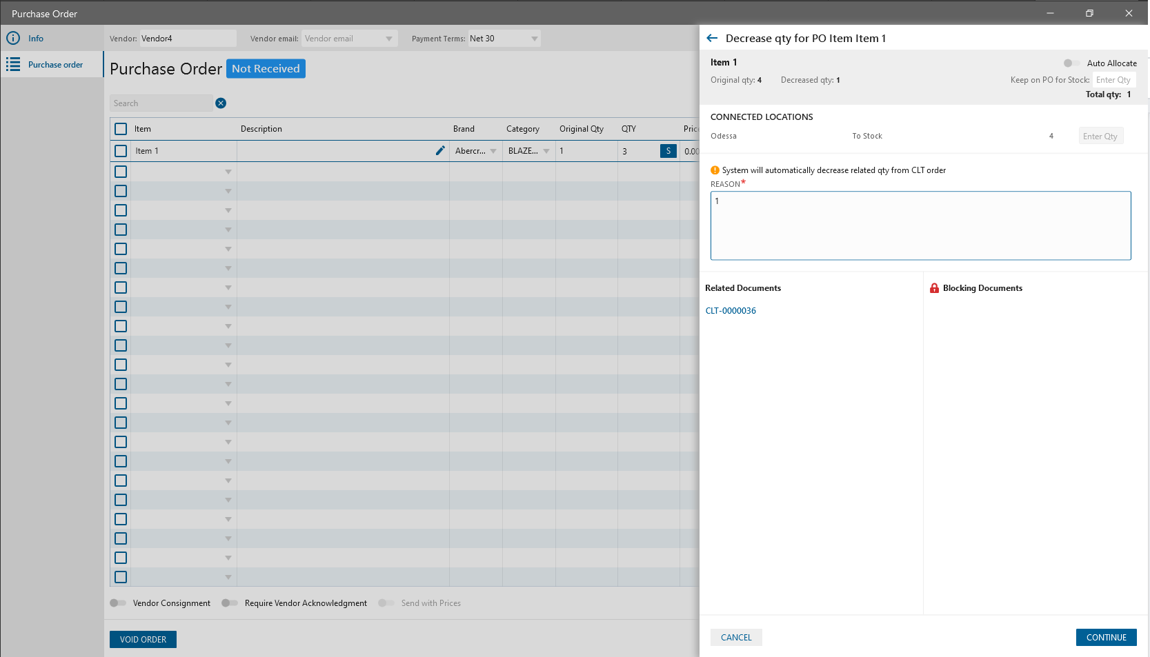 If line item Qty on PO was decreased/delete/voided and PO linked to CLT then the action manager will be displayed with the warning: “Attention, the QTY in related CLT order will be decreased automatically”