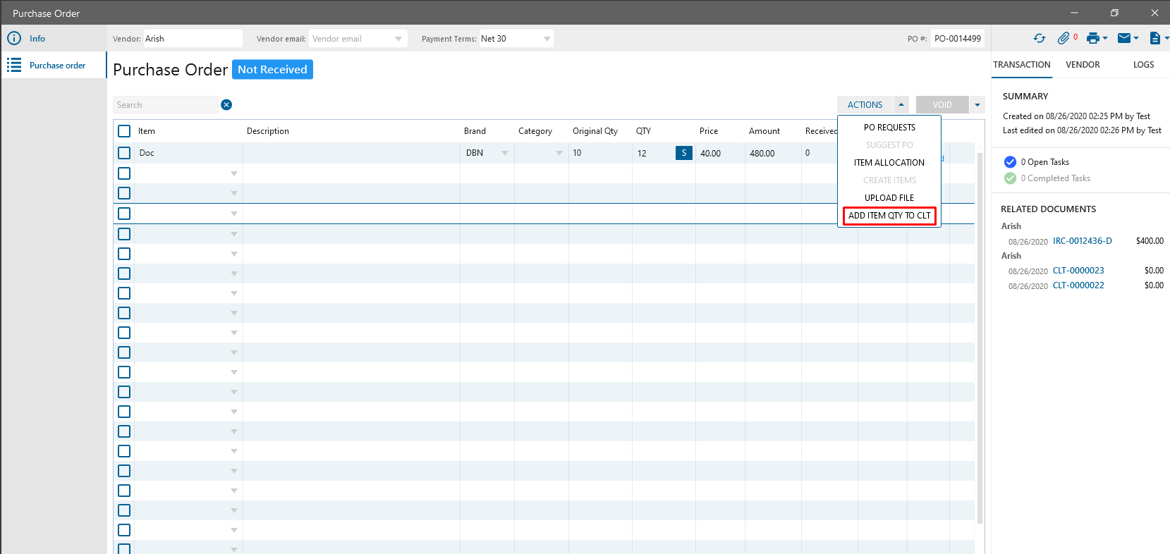 For this function “Add Item qty to CLT” button was added to the “Action” multi-button (enable if only to PO linked at least one CLT and any PO Item Qty not linked to CLT order). After clicking on the button, the “Link item qty to CLT Order” panel will be opened. On the opened after clicking on the button panel, User is able to link entered Qty to the required CLT Order.