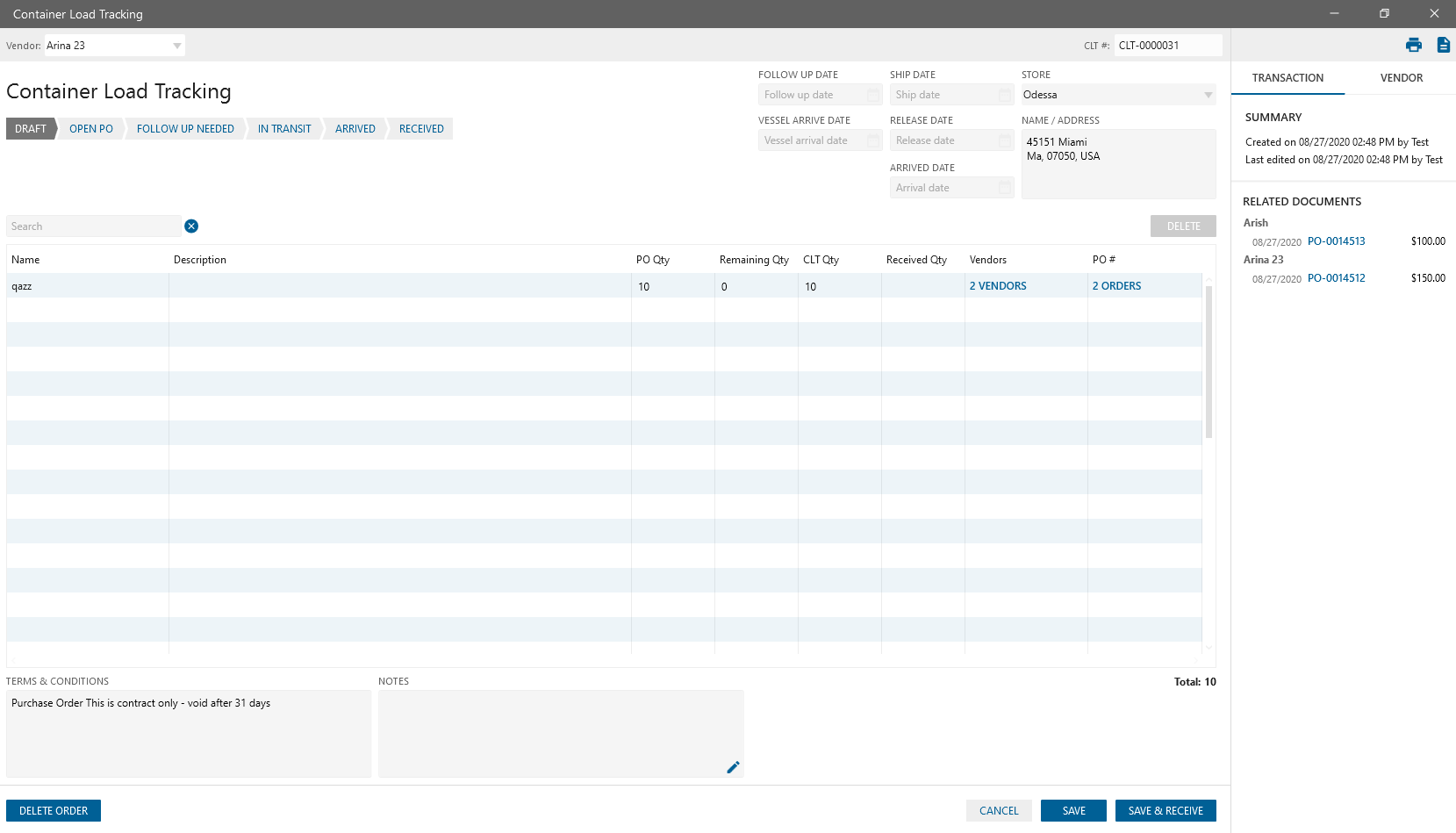 New Vendor module section – Container Load Tracking (CLT) was added to track purchased Items at every logistic point and lets group POs with different Vendors for different Containers.