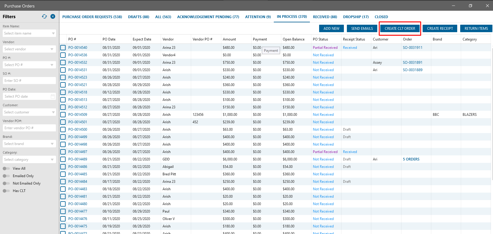 “Create CLT” button is added to the PO list form to the “In Process” bucket. After clicking on the button, CLT Order will be created and all Items from the checked PO will be linked to the corresponding CLT Order.