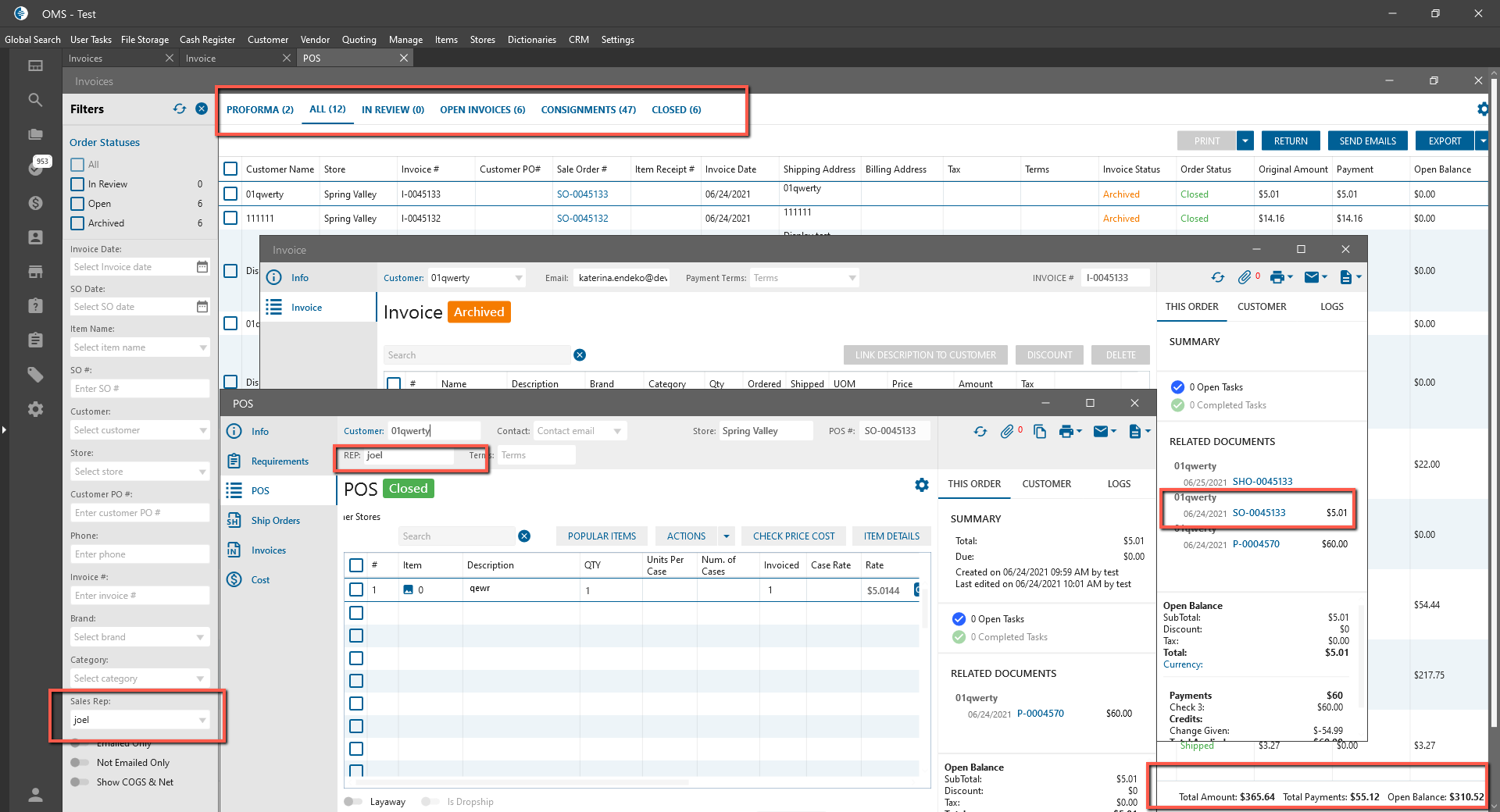 - Invoices are filtered by SO with selected Sales Rep;