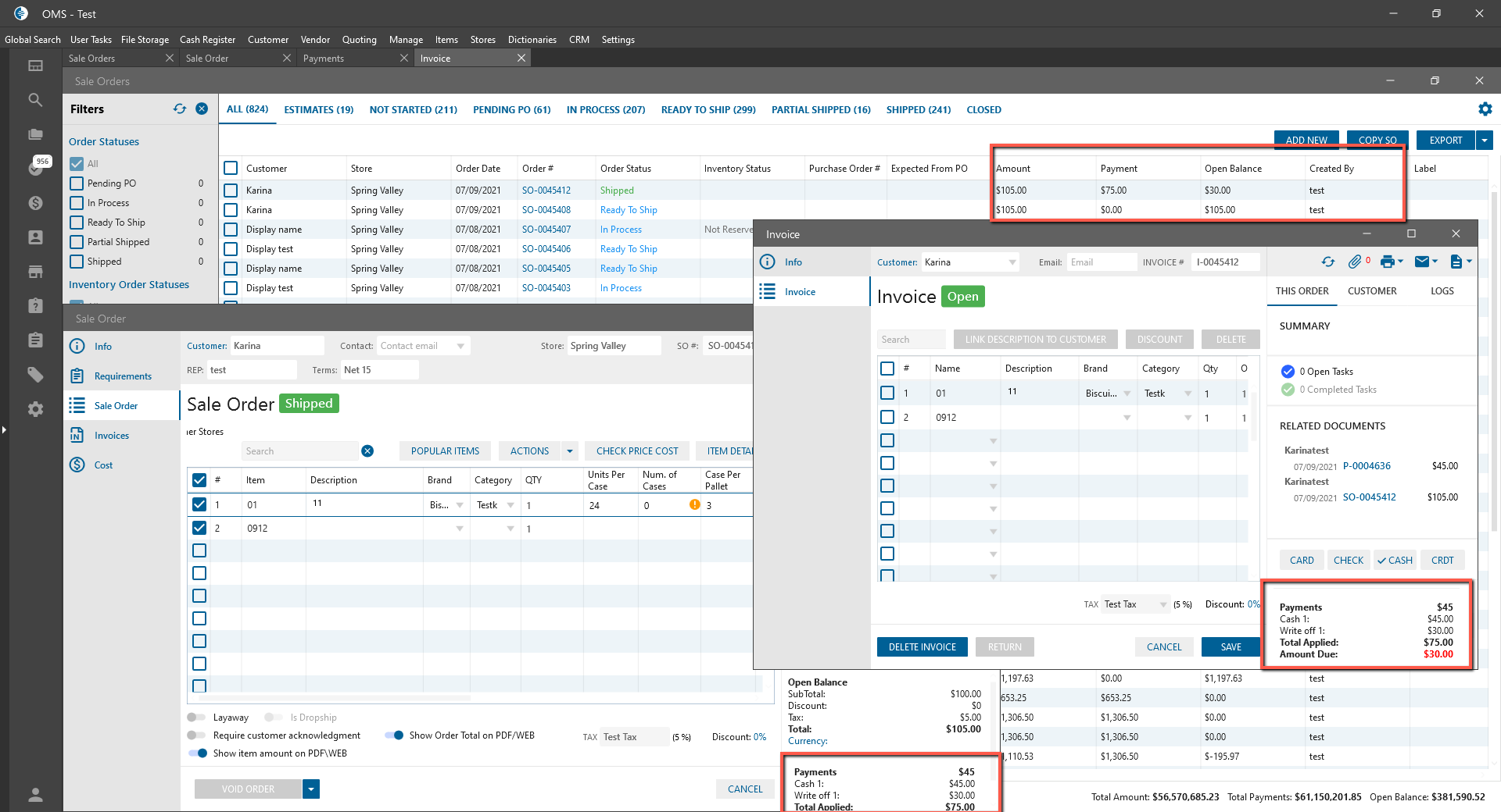 - Add Payment and some Write Off, select payment method and Account -> Save;